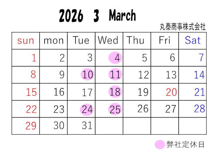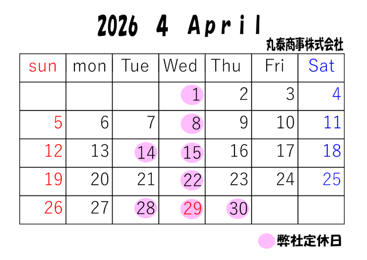【営業日変更のお知らせ】 弊社では、2025年1月より、毎週水曜日、第2、第4火曜日を定休日とさせていただくこととなりました。 皆様には、大変ご不便をお掛けいたしますが、ご理解くださいますようお願い申し上げます。